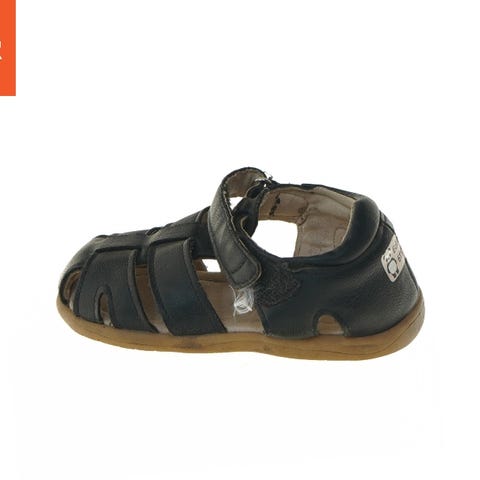 Sandalerne er brune og lavet af læder. De har flere stropper og spænder for justering, perfekt til små børn. Sandalerne har en robust sål med godt greb, hvilket gør dem ideelle til udendørs leg. Størrelsen er 19, som passer til små børn. De viser tegn på slid, især på sålerne, men er stadig funktionelle.