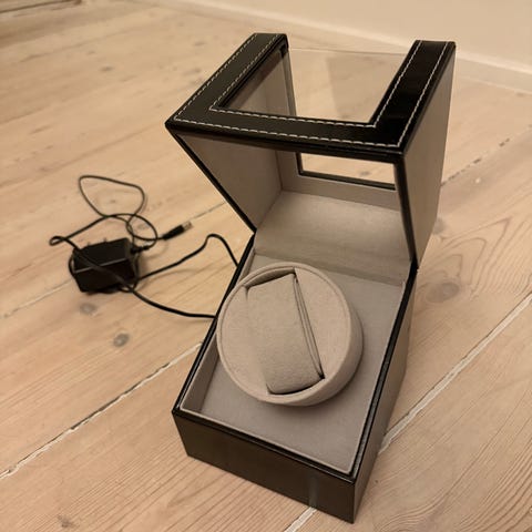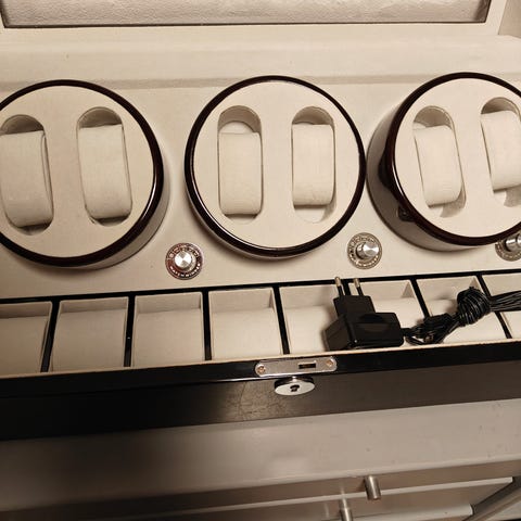 Modalo Timeless 2+3 ur-optrækker med plads til 2 ure (winder) samt 3 ekstra opbevaringspladser. Sort højglans kabinet med cremefarvet interiør. Kører både på batteri (3V) og strømforsyning. Flere rotationsprogrammer.