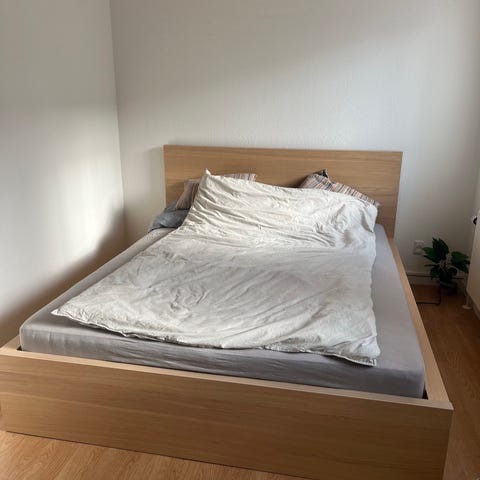 Ilva seng med brun træramme. Sengen har hovedgavl og lave, brede sengeben i samme træfinish. Madras +topmadras medfølger. Topmadras trænger til udskiftning