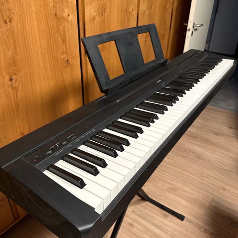 Yamaha Arius digitalpiano i sort finish. Instrumentet har fuldt klaviatur med 88 tangenter og indbyggede pedaler. Kontrolpanelet omfatter tænd/sluk, master volume samt funktioner som metronom og forskellige klangindstillinger. Velegnet til øvning i hjemmet, undervisning og generel musikudøvelse. Digitalpianoet står på fast stativ og har klaplåg over tangenterne.