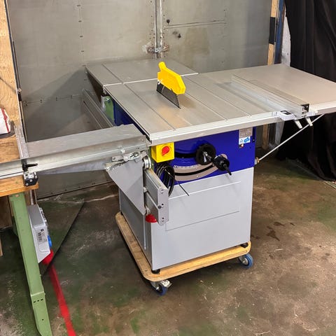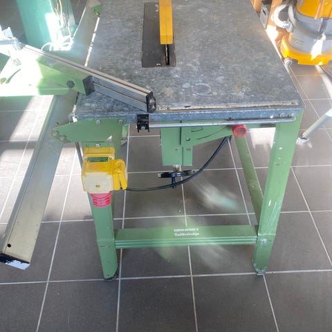 Elektra Beckum KGT 500 kombinationssav i grøn udførelse. Maskinen er en stationær sav med bord og integreret motorenhed. Savbordet har runddrejeligt område med gradinddeling til geringssnit samt parallelanslag. Maskinen er monteret på stativ for arbejde i behagelig højde.