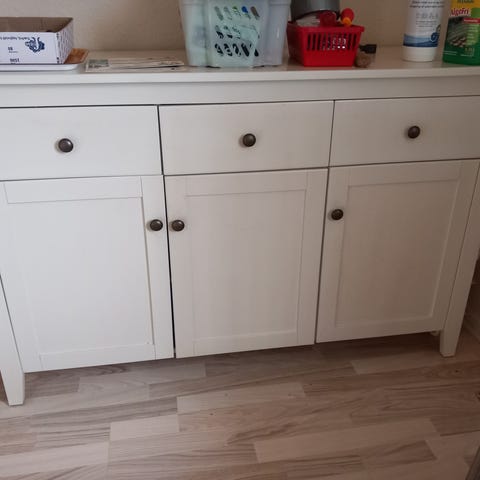 Opdelt i 3 rum, 2 med låger og et med 3 skuffer.
