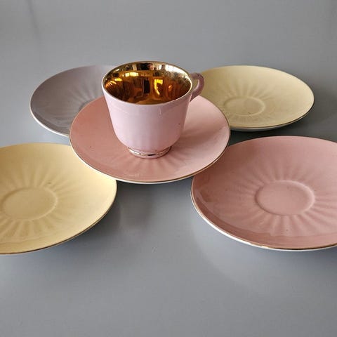 Fineste sæt med kop og underkop fra norske Figgjo Flint. Stellet hedder Margrethe. Jeg har to sæt; et mintfarvet og et grå/sand. Begge er guldfarvet indvendigt. Det grønne fremstår let krakeleret i overfladen men begge sæt er intakte og uden skår. Måske dine nye moccakopper?