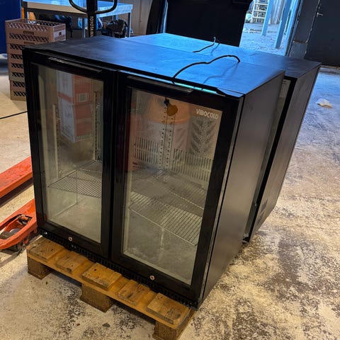 Glasdørskøleskab med 3 glasdøre i sort kabinet. Indvendigt med metalhylder og justerbare hyldebærere, så indretningen kan tilpasses forskellige typer drikkevarer eller fødevarer.