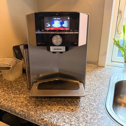 Siemens EQ.9 connect s900 fuldautomatisk espressomaskine i rustfrit stål. Maskinen har integreret farvedisplay på fronten med valg af forskellige kaffedrikke, herunder blandt andet flat white. Betjeningen foregår via drejeknap og touchknapper under displayet.