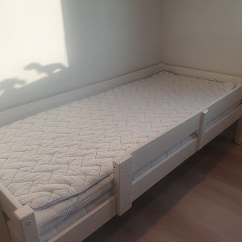 Sengen har 2 skuffer til opbevaring og kommer samtidig med en god tyk madras. Sengen har været brugt i halvandet år, så er stadig relativt ny.