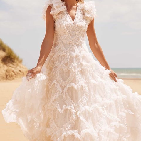Needle & Thread Midsummer Lace Off-Shoulder Gown str. L. Lang kjole i champagnefarvet blondestof, med broderede detaljer og lagdelt skørt. Kjolen har off-shoulder udskæring med korte, rynkede ærmer og markeret talje. Egnet til brug ved fester og andre formelle anledninger.