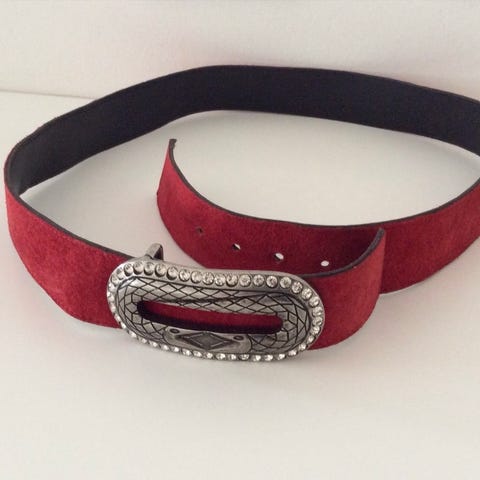 Bæltet er bredt og har et krokodillemønster over det røde materiale, som giver det et elegant og råt udseende. Det har en robust metalklemme til lukning og justering. Bagsiden af bæltet ser ud til at være sort og glat. Bæltets længde er 100 cm, hvilket gør det velegnet til de fleste størrelser. Dette bælte kan både bruges som en fashion statement eller for at tilføre et stilfuldt præg til et outfit.