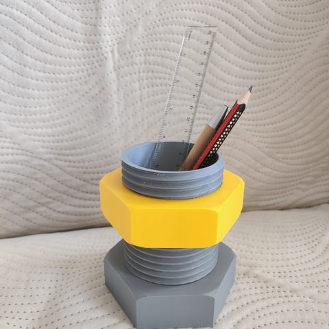 Objektet er en transparent penneholder lavet af klar plastik, bestående af tre separate sektioner, der er samlet til en hexagonal form for at kunne opbevare kontorartikler som penne, blyanter eller små værktøjer. Det giver et stilrent og minimalistisk udtryk, ideelt til skriveborde eller kontorarbejdsområder. Målene er 13,5x12 cm.