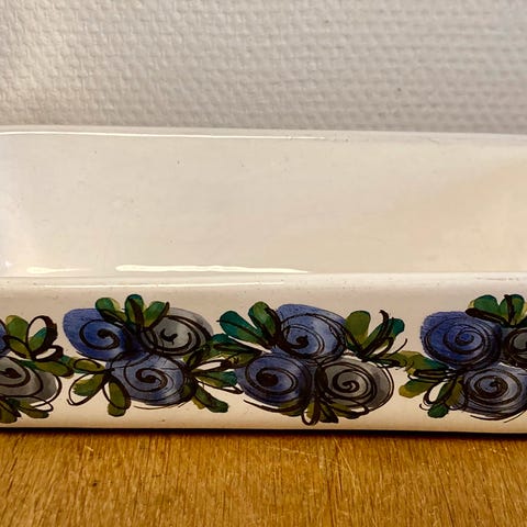 Bangholm postejform dekoreret med fire blomstermotiver i klare farver langs kanten og har to mindre håndtag på hver kortside, der gør det nemt at tage fat i. Den primære bundfarve er hvid med grønne og røde nuancer i det malede blomstermotiv. Bunden har en ubehandlet terrakotta-finish, hvor der også er en præget mærkning - Ovnfast Bangholm Danmark. Måler 22 cm i længden, 10 cm i bredden og 6 cm i højden.
