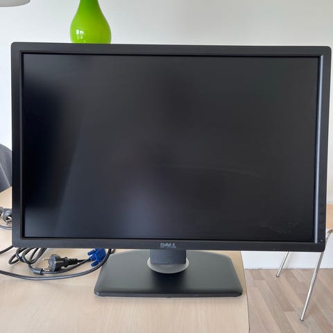 Dell skærm med 24 tommer skærmstørrelse i sort. Skærmen står på en rektangulær fod med højdejusterbart stativ og kabelgennemføring i søjlen. Egnet til almindeligt kontorbrug, internet, tekstbehandling og anden daglig computerbrug.