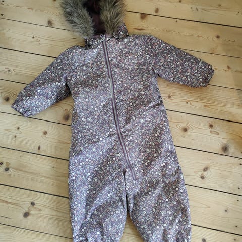 Flyverdragt i pink farve med en hætte og lynlåslukning foran. Dragten har elastik i taljen og manchetter ved hænder og fødder for at holde varmen inde. Der er refleksbånd ved benene for ekstra synlighed.
