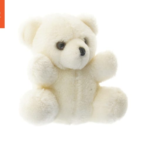 Denne bamse er lavet af blødt og skraveret stof og har en lyseblå nuance. Den er cirka 40 cm høj. Bamsen har et kurvet design med synlige ører og næse, og der er en syet etikette, der muligvis angiver varemærket.