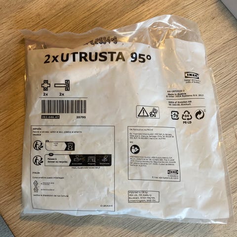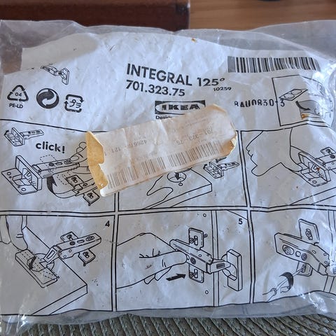 IKEA Utrusta hængsel 153°. Pakken indeholder 1 hængsel (er åbnet) med tilhørende beslag og skruer til montering af skabslåger. Velegnet til køkken- eller opbevaringsskabe.