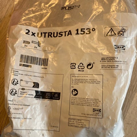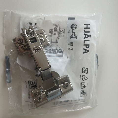 IKEA Utrusta hængsler 95°. Pakke med 2 hængsler til køkken- eller skabslåger. Vinkel 95°. Inkluderer monteringsdele som vist på billederne. Pakken er åbnet.