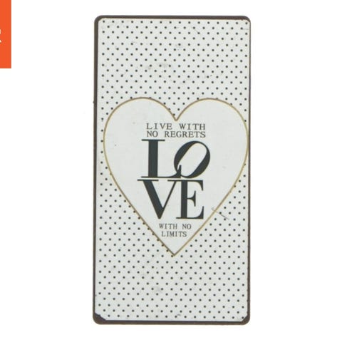 Et lille dekorativt skilt med et kærlighedsbudskab. Skiltet har en hvid baggrund med sorte prikker og i midten er der et hjerte med teksten 'Live with no regrets, love with no limits.' Bagsiden af skiltet er sort og har en mærkat med stregkode og webadresse. Skiltets størrelse er 10x5 cm og kan nemt placeres på forskellige overflader i hjemmet som en del af indretningen.