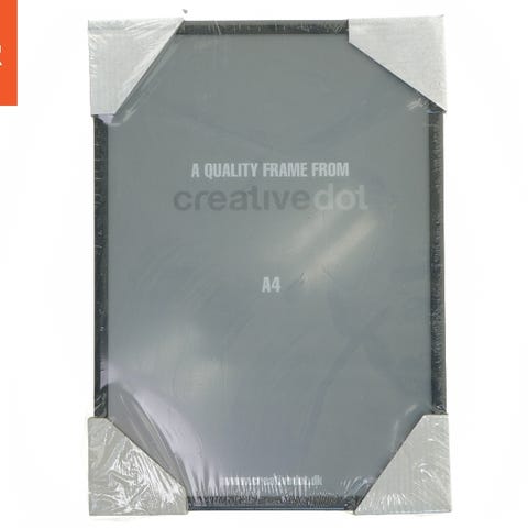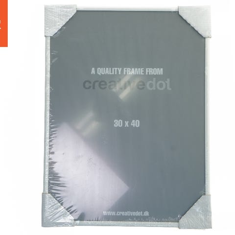 Dette er en kvalitetsbillederamme fra Creative Dot med en størrelse på 30x40 cm. Rammen er indpakket og har beskyttelsesmateriale på hjørnerne. Billedet viser at rammen har beslag på bagsiden til ophængning. Den er designet til at beskytte og vise dine fotos eller plakater på en stilfuld måde.