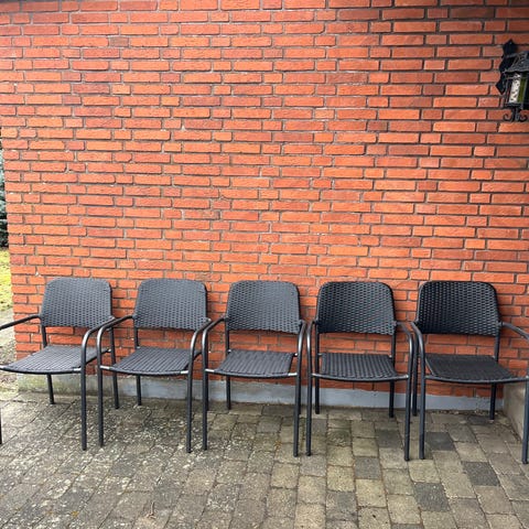 (6/7 stk.) Sæt havestole i flet med armlæn i brun farve og beige sædehynder. Stolene er velegnede til terrasse eller have og har høj ryg samt faste ben med metalfødder. Fletmaterialet er designet til udendørs brug, og hynderne giver ekstra siddekomfort. Egner sig til brug omkring havebord eller som loungestole på terrasse.
