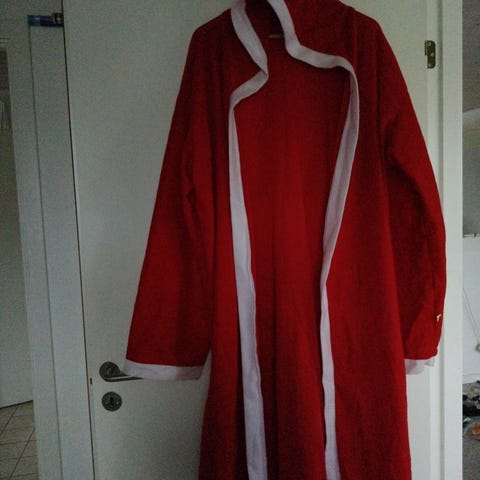 En klassisk julemandshue i rødt stof med hvid kant og en lille hvid pompon på toppen. Størrelsen på huen er 43x29,5 cm.