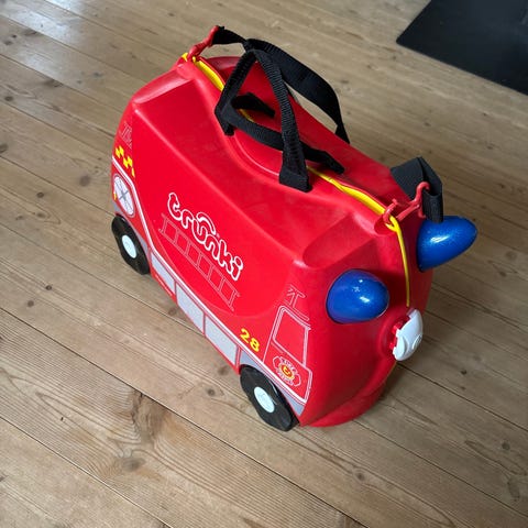 Denne kuffert fra Trunki er designet som en brandbil. Den er robust med hjul, hvilket gør den nem for børn at transportere. Kufferten har et indre rum med stropper til fastgørelse af indhold. Den er lavet af plastik og har en bærerem. Kufferten måler 46x20x31 cm.