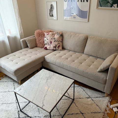 Sofaen er kun 2 måneder gammel og fremstår fuldstændig som ny uden brugsspor, pletter eller slid. Det er modellen med bred chaiselong, hvilket giver ekstra god plads til at flyde og slappe af.