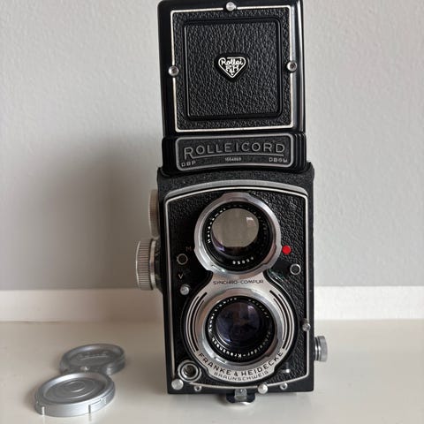 Rolleicord analogt twin-lens reflex kamera med to objektiver og søger øverst på huset. Kameraet er et klassisk mellemformat TLR-kamera, hvor motivet komponeres gennem den øverste linse og billedet optages gennem den nederste. Medfølgende læderetui er monteret på kameraet og beskytter huset under brug og opbevaring. Velegnet til fotografering på film for brugere, der ønsker et mekanisk kamera med manuel betjening og søgerbillede set ovenfra gennem matglas.
