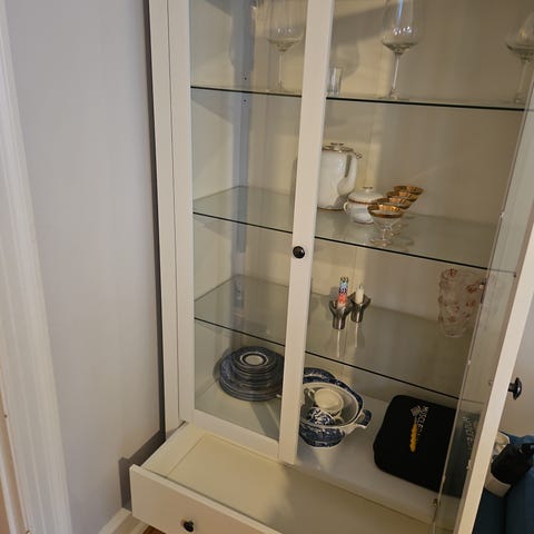 JYSK Vitrineskab med 2 låg i hvid/eg. Har 3 hylder og en skuffe.