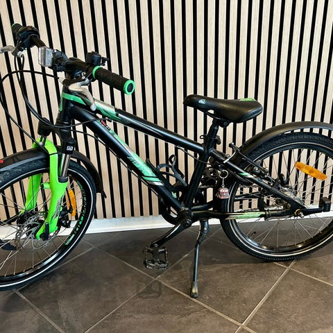 Junior mountainbike med 20" hjul, 6 gear revoshift fra Shimano, skivebremse på forhjulet og fælgbremse bagpå.