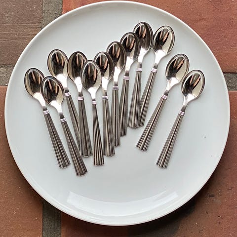Margit Brabdt bestik sæt i sølvfarvet metal med dekorerede skafter.