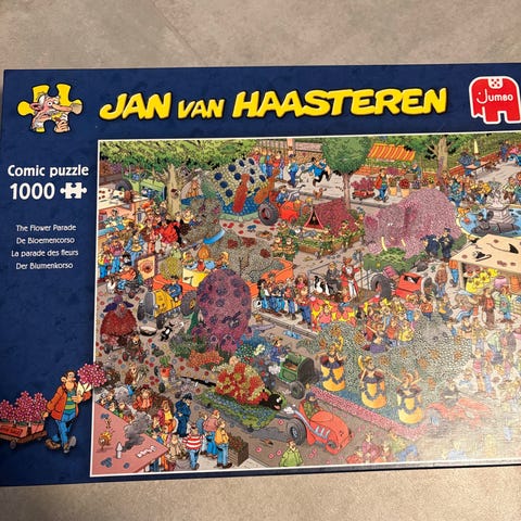 Jan van Haasteren puslespil med 2 motiver á 1000 brikker hver. Motiverne forestiller humoristiske og detaljerede scener, blandt andet grillfest og madboder. Sættet indeholder desuden en plakat af et af motiverne. Egnet til puslespilsentusiaster, der kan lide farverige og tegneserieprægede motiver med mange detaljer.