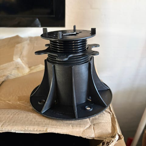 Justerbare plastfødder til brug som underlag for terrassebrædder eller fliser. Fødderne er fremstillet i sort plast og har ottekantet fodplade med forstærkningsribber. Højden kan justeres via gevind i midten, så underlaget kan udlignes. Mellem 3,5 og 6,5 cm.