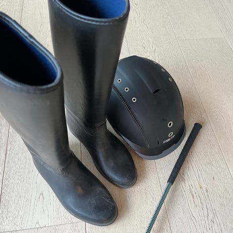 Horze Equestrian DIY ridehjelm og sikkerhedsvest i sort. Sættet består af en polstret sikkerhedsvest med justerbare skulder- og sideåbninger samt en ridehjelm i str. 55-56 cm (S/M) med justerbar rem under hagen og ventilationsfelter. Ridestøvler str. 37