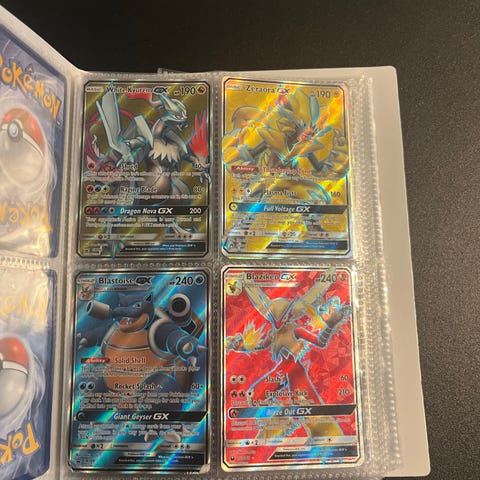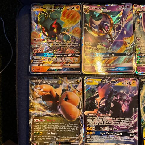 Pokémon blandet lot samlekort med forskellige GX-, EX- og V-kort samt flere holo- og full art-kort. Kortene stammer fra forskellige sæt og serier og omfatter flere typer Pokémon og trænere. Egnet til samling eller udvidelse af eksisterende kortsamling. Antallet af kort og specifikke udgaver fremgår af billederne. Kan også sælges enkeltvis.