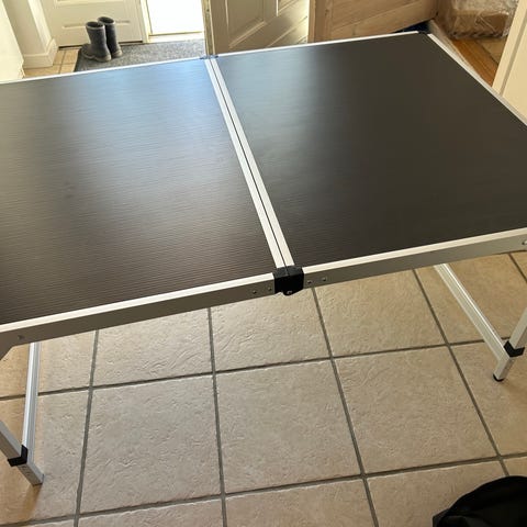 Sammenklappeligt bord i hvidt metalstel med grå bordplade. Bordet står på fire ben med tværstivere for ekstra stabilitet og kan klappes sammen for nem opbevaring og transport. Velegnet som ekstra spisebord, arbejdsbord eller hobbybord i hjemmet eller sommerhuset.