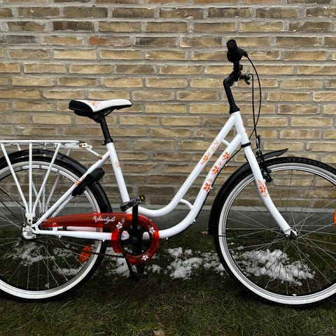 Børnecykel med 24" hjul i hvid farve. Cyklen har lav indstigning, kurv foran og bagagebærer bagpå. Udstyret med støtteben og håndtag med bremser. Egnet til større børn, der passer en 24" cykelstørrelse, til daglig kørsel til skole og fritidsaktiviteter.