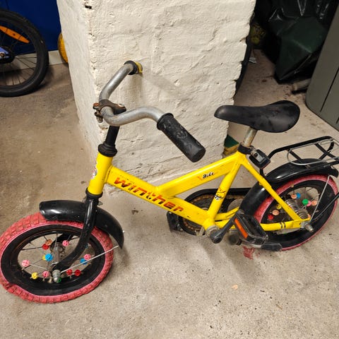 Winther V150 børnecykel med 18" hjul. Cyklen har lav indstigning og fastmonteret kædeskærm. Udstyret med bagagebærer, kurv foran, skærme og reflekser. Farven er lilla med sorte detaljer. Har været brugt at to piger, så har brugsspor, men kører fint! Kurven har fået tryk, så sidder lidt skævt.