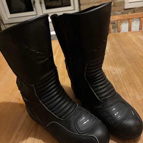 Motorcykelstøvler i sort farve. Støvlerne er højskaftede med forstærkninger omkring ankel, hæl og skinneben. De har lukning i siden og indvendigt meshfor, som giver ventilation. Egnede til brug på motorcykelkørsel som beskyttende fodtøj.