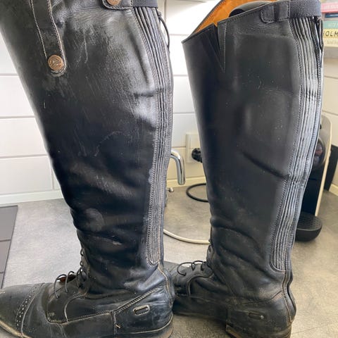 Polostøvler fra Kempkens i gråt og blåt ruskind. Top håndlavet kvalitet fra Tyskland. Lavet stive som dressurstøvler. Støvlerne er lavet i marts 2022. De var oprindeligt helt grå, men har været forbi Kempkens til reparation og har fået helt ny inderside på skafterne i blåt ruskind, og nyt læder indvendig, nye stivere og læder bagpå og nye lynlåse. Har ikke været brugt siden.