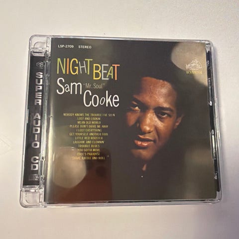 Sam Cooke "Night Beat" lp. Udgivelse på RCA Victor, produceret af Hugo & Luigi og udgivet i samarbejde med Analogue Productions. Orkestret er dirigeret af René Hall. Albummet indeholder numre som "Nobody Knows the Trouble I've Seen", "Lost and Lookin'", "Mean Old World", "Please Don't Drive Me Away", "I Lost Everything", "Get Yourself Another Fool", "Little Red Rooster", "Laughin' and Clownin'", "Trouble Blues", "You Gotta Move", "Fool's Paradise" og "Shake Rattle and Roll". Oplysninger på coveret angiver både mono-katalognummer LPM-2709 og stereo-katalognummer LSP-2709.