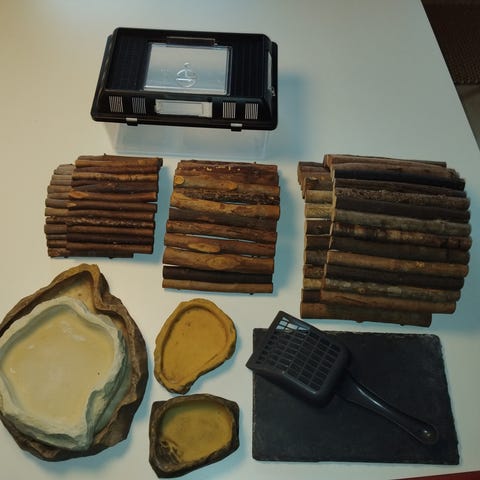 Forskellige skjul, fatninger og vandskåle. Der er også et vandfald, to varmeledninger (dog en med hul). Kom endelig med bud og spørgsmål.