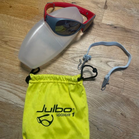 Kvalitetssolbriller til børn fra Julbo m. rem, cover og pose/pudseklud