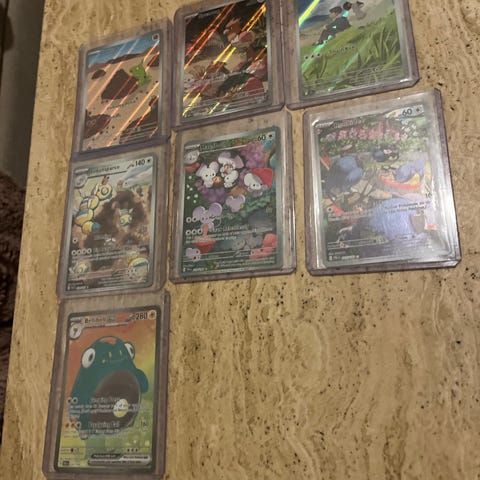Jeg sælger disse tre fine Pokémon kort fra Stellar Crown serien. De er opbevaret i sleeve og toploader.