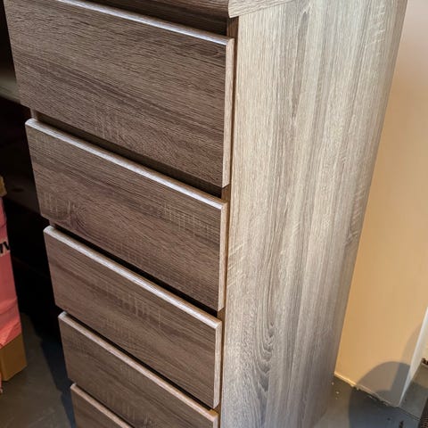 Fronten ligner mange små skuffer, men det er låger med hylder bagved, hvilket giver god og praktisk opbevaringsplads.