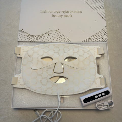 LED Light Therapy Mask ansigtsmaske i hvid silicone. Masken har indbyggede LED-lys i 4 forskellige farver og leveres med elastiske stropper, kontrolenhed og USB-kabel til strømforsyning. Produktet er beregnet til brug i ansigtet og kan anvendes derhjemme som en del af hudplejerutinen. Leveres i original æske. Varen er ubrugt.