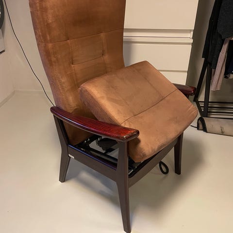 Stolen har små 20 år på bagen og er brugt dagligt i ca. 5 år. Resten af tiden har den stået lunt og tørt i gæsteværelse.