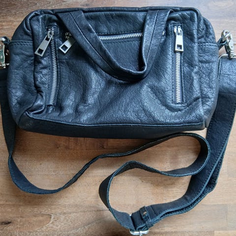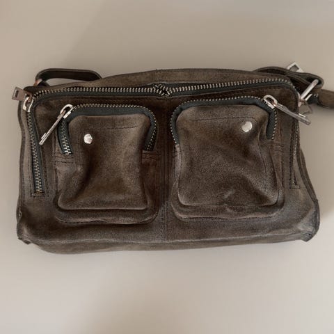Nunoo taske i ruskind til kvinde. Tasken er lille og kompakt med afrundet form og kæderem i metal. Forsiden har flere lynlåslommer til småting, og hovedrummet lukkes med lynlås. Indvendigt er der foret rum med Nunoo-mærke. Velegnet som mindre skulder- eller crossbodytaske til hverdag eller byture.