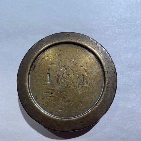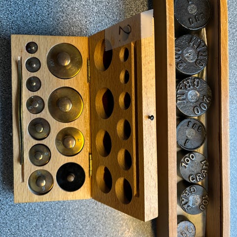 Fint gammelt vægtlod sæt. I original trækasse. De 2 mindste lodder mangler, men sættet er stadig fint og dekorativt. Ægte retro.