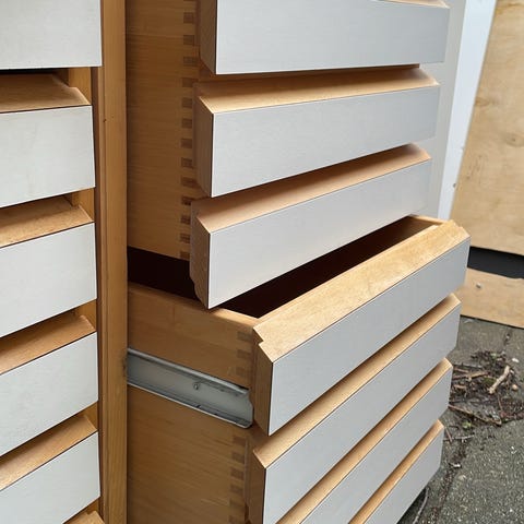 - Et er med skuffeindsatser med bestikbakke og anden indsats