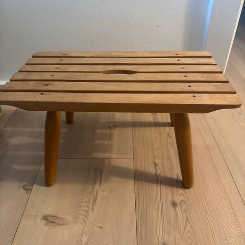 Lille kvadratisk fodskammel med polstret sæde og tekstilbetræk med diskret blomster- og stribemønster i lys nuance. Gammel. Skamlen står på fire runde træben (det ene mangler ca 1/3 - ormespist) og er velegnet som støtte til fødderne ved stol eller sofa, eller som lille siddeplads eller afsætningsplads i stue eller soveværelse. 25 x 25 cm. højde 10 cm. Fra røgfrit hjem. Kan sendes med gls. Køber betaler porto. (H)()(26)
