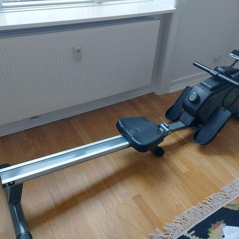 Kettler romaskine med digital skærm. Maskinen har glideskinne med sæde, fodstøtter med remme og håndtag til roning. Den digitale skærm viser grundlæggende træningsdata som tid og antal tag. Egnet til indendørs konditions- og styrketræning af hele kroppen.